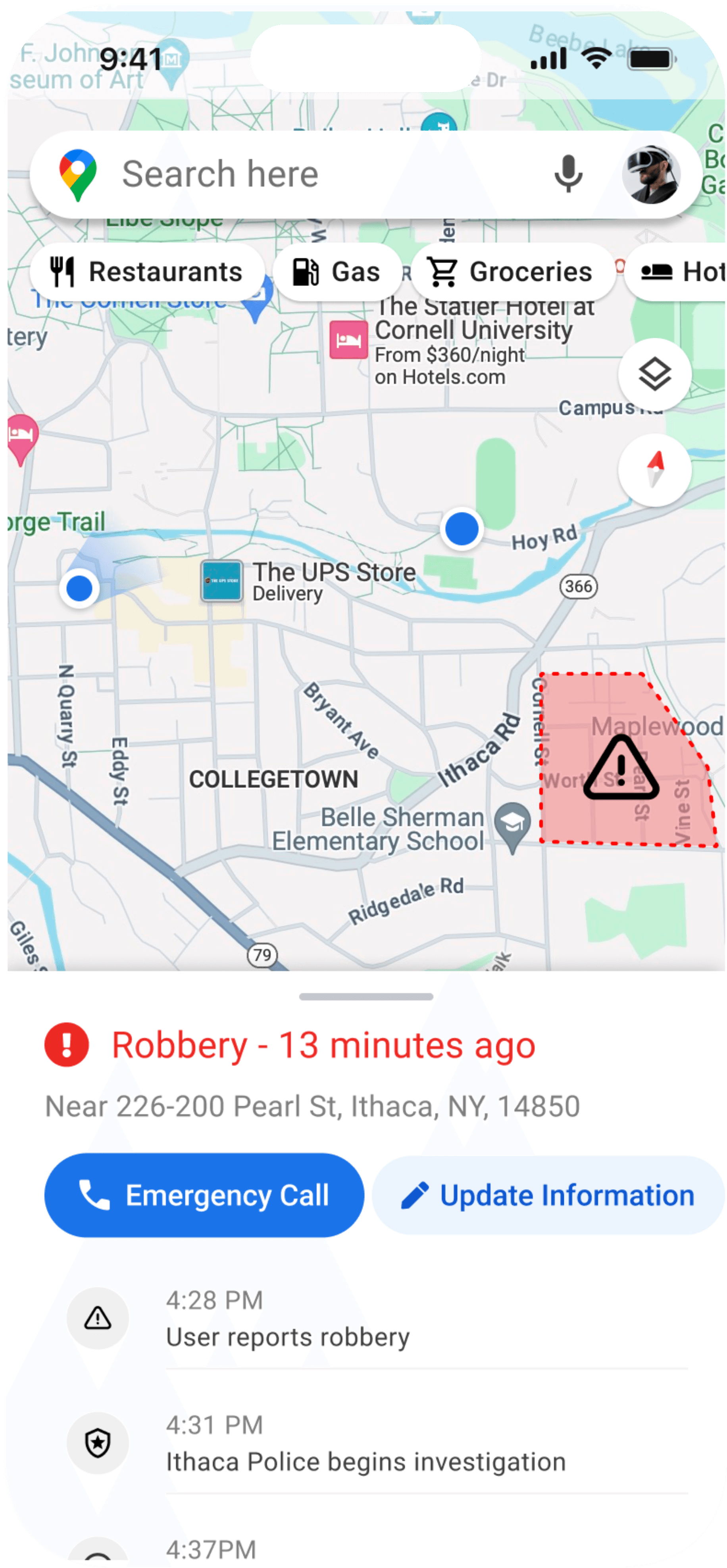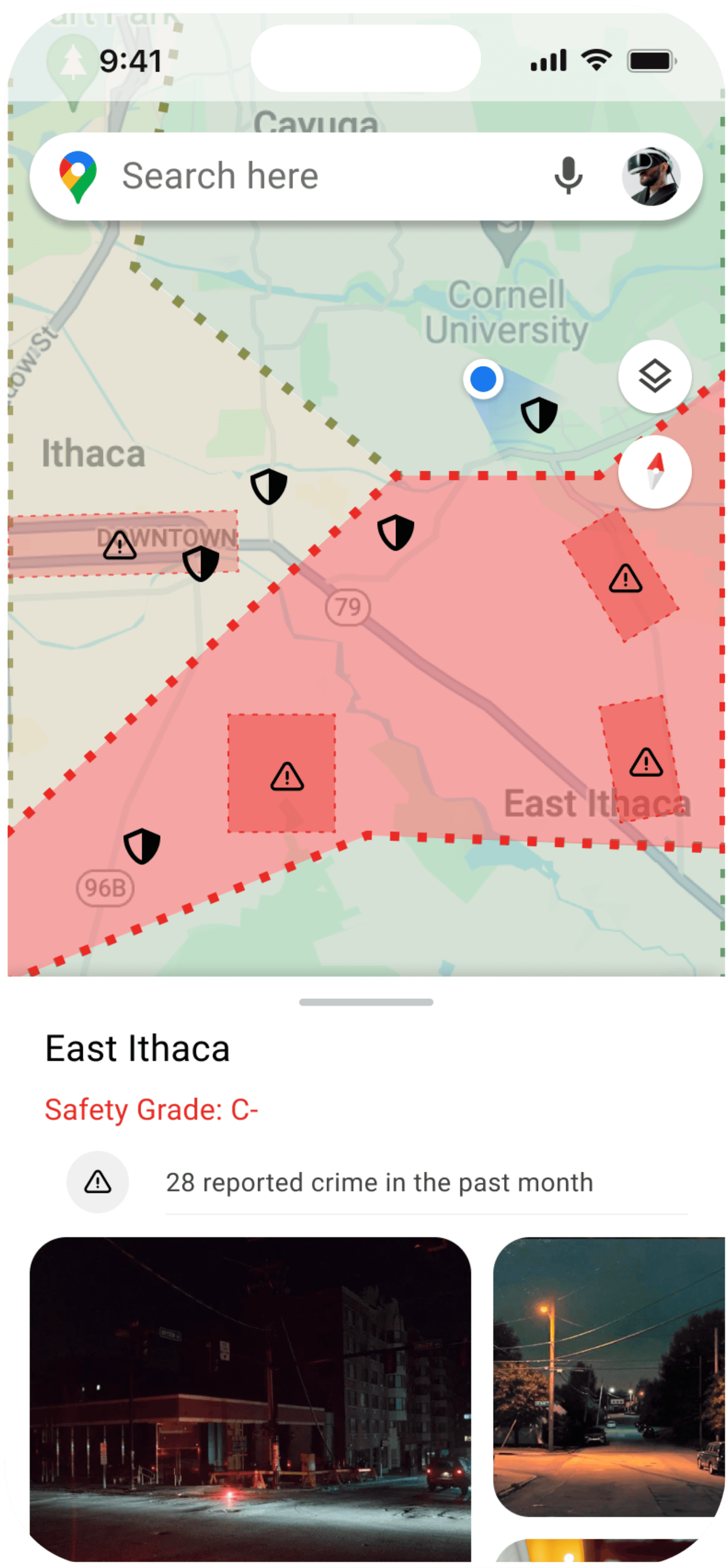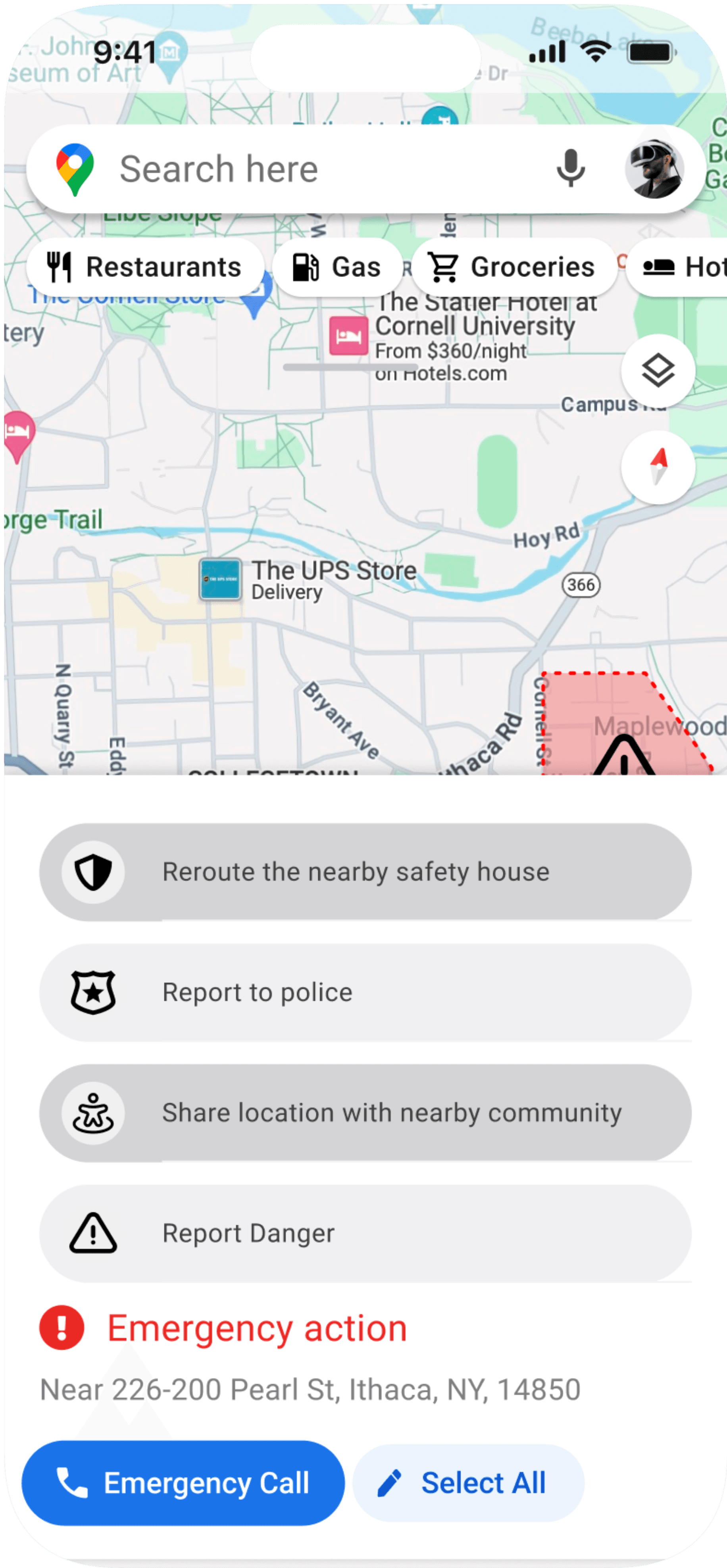 Users will be notified when there’s a danger nearby. When user is using Google map, she/he can report danger on app clip.