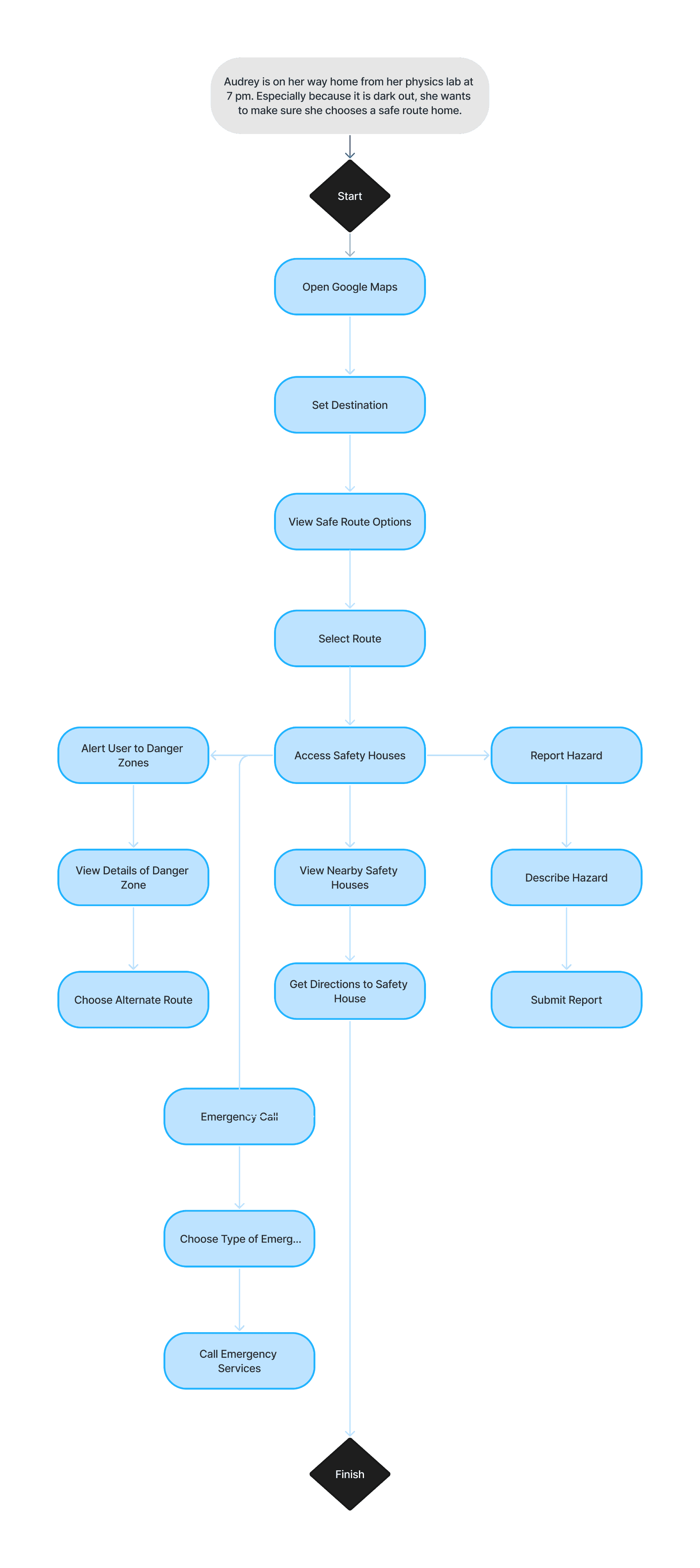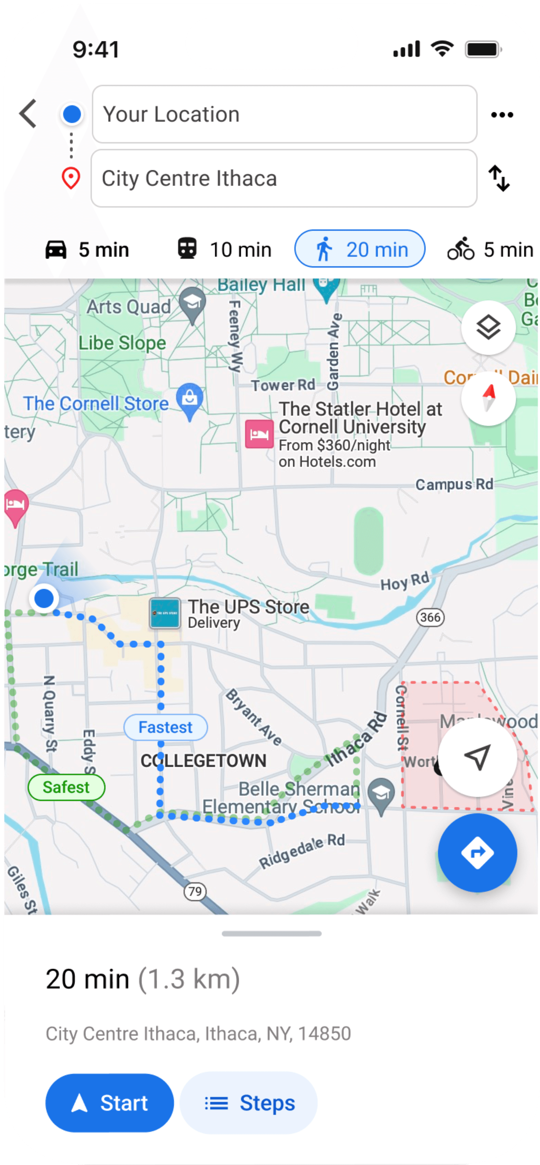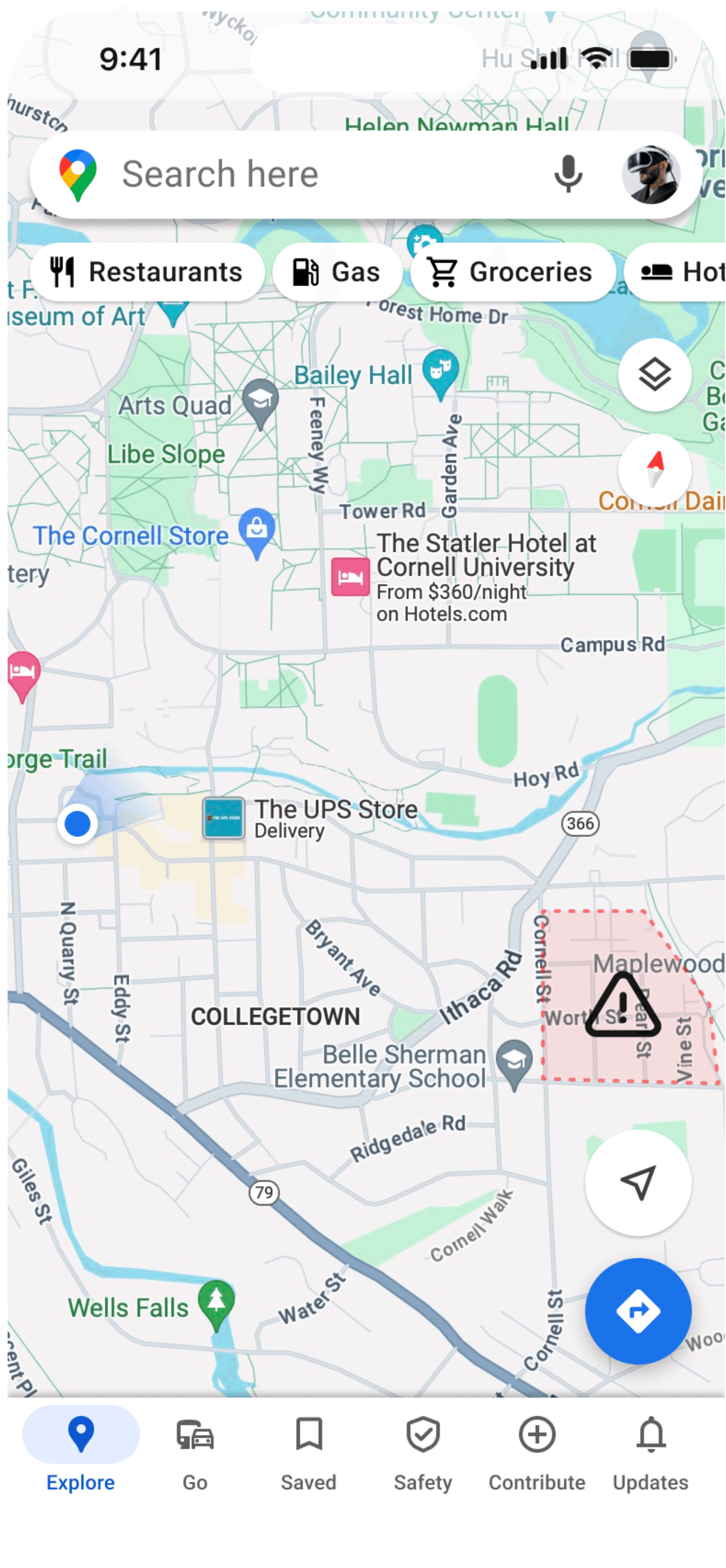 Mary is a junior who lives alone in college town. She often goes back at midnight because she needs to practice in her dance club, breakfree and loko. Mary used to take bus to her apartment, but due to the construction in Collegetown, she has to walk, and sometimes needs to change her route because of construction. She feels the path back home is safe because it’s close to campus and have street light all night.