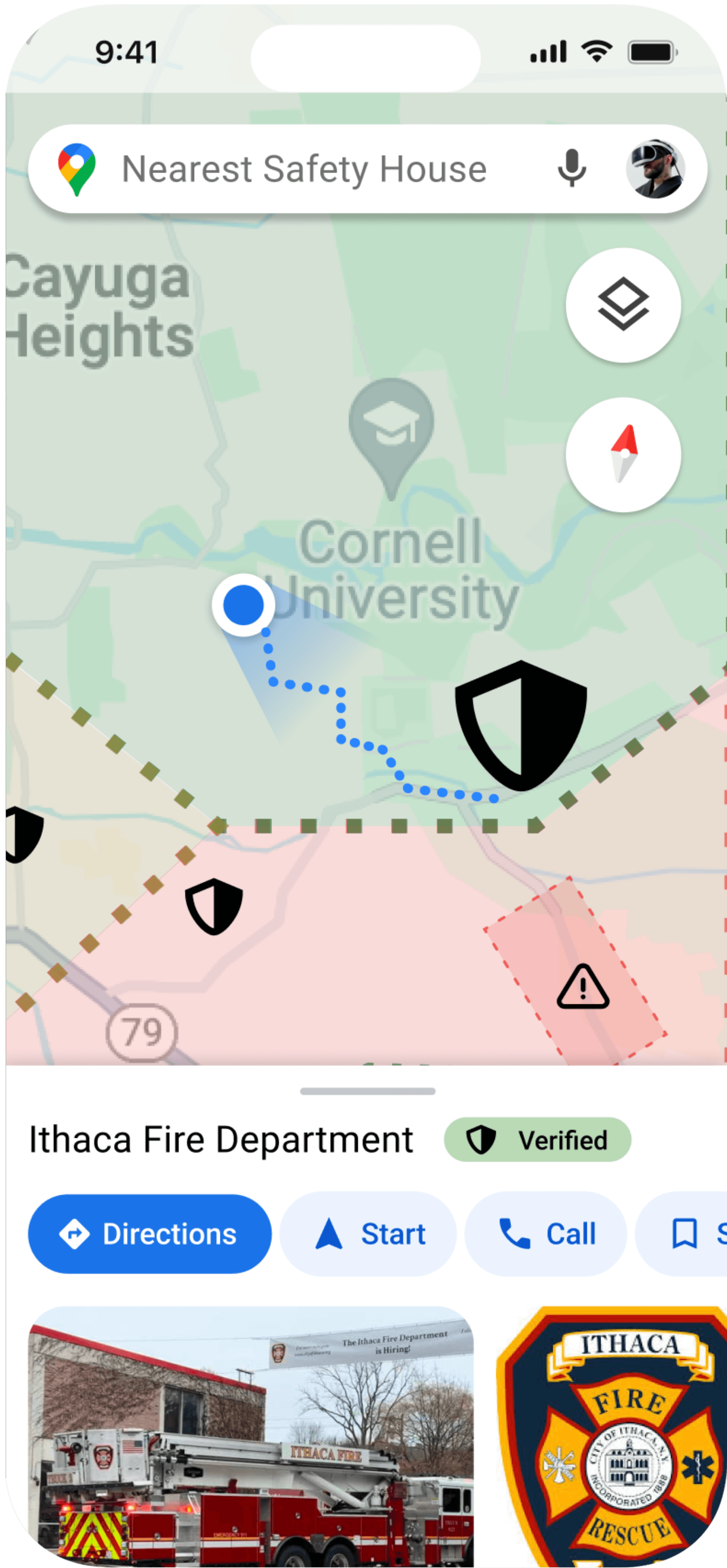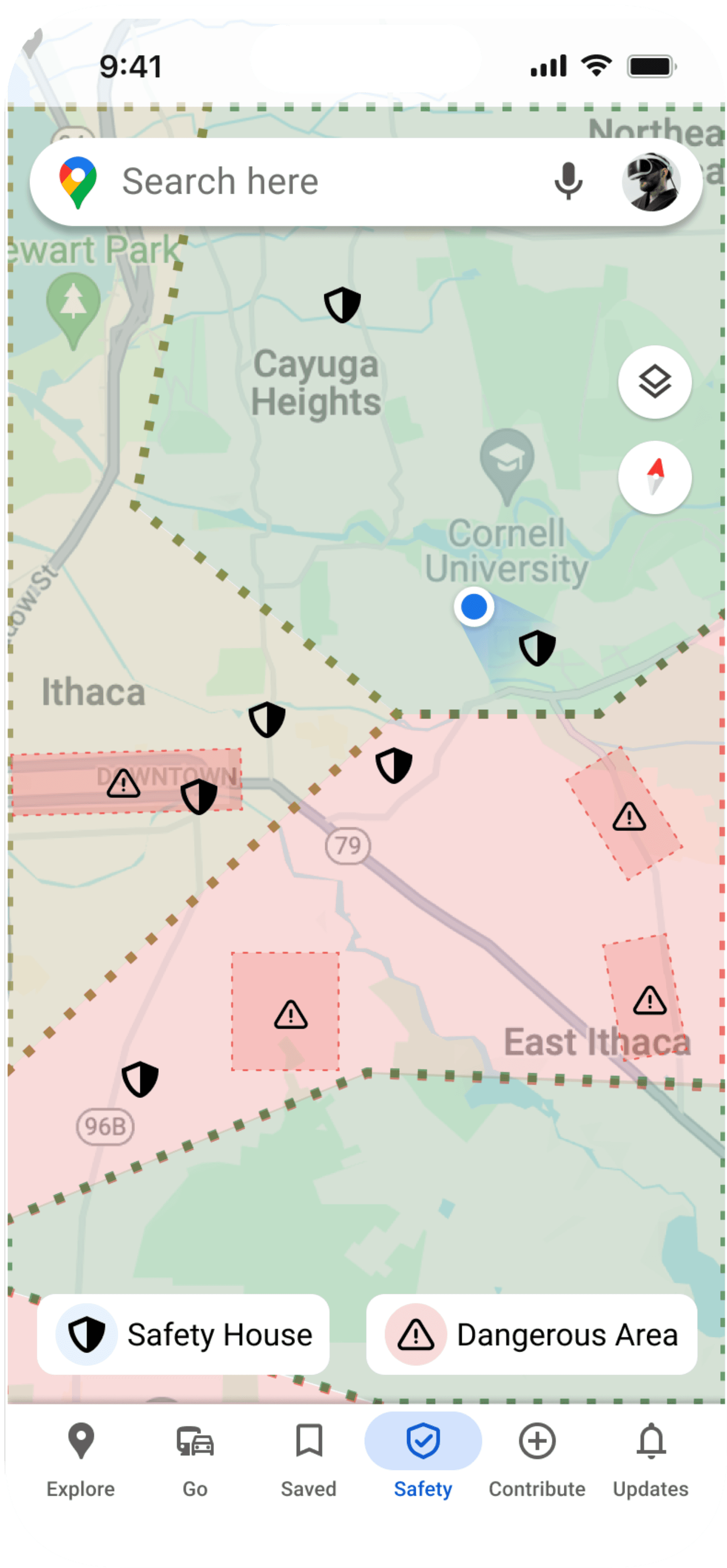 Verified safety house in the community will be listed on Map. Dangerous Areas will be Specified. People can go to nearby safety house to seek for help when facing danger.